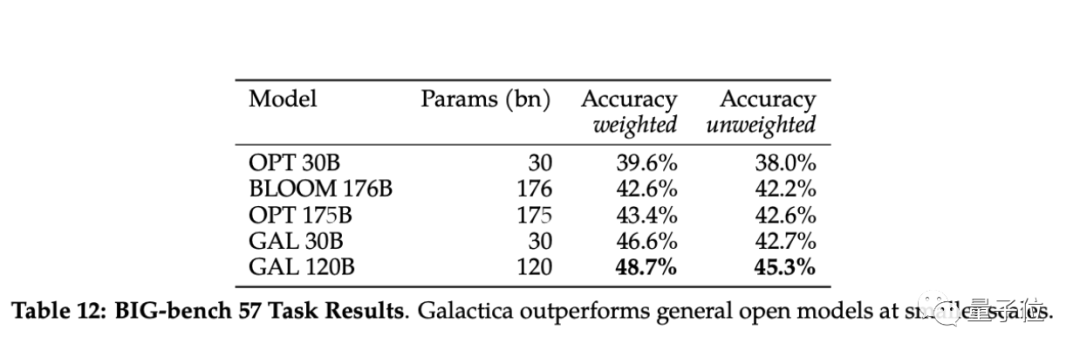 尽管,GAL并没有经过一般数据集的训练,但它在BIG-bench上的表现仍旧优于BLOOM和OPT-175B。