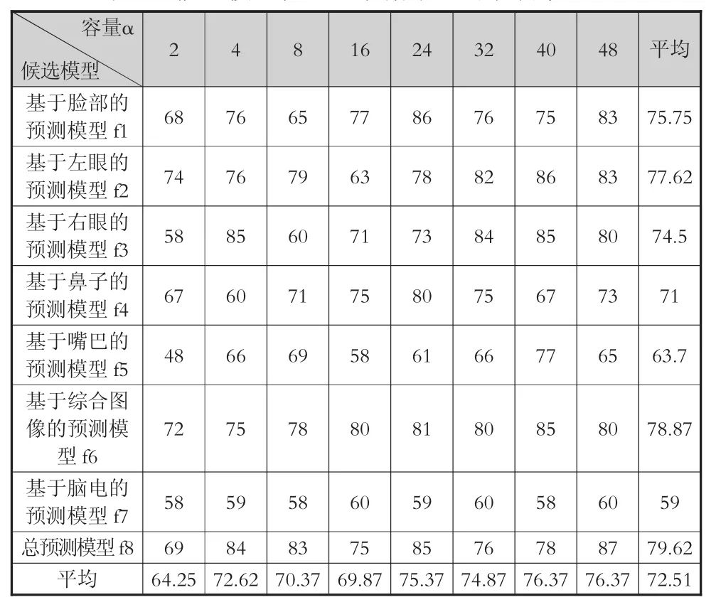 在实验结果中,α大于24的模型在验证集上的准确率约在75%。具体而言,对于相同容量条件,在预测模型中,总预测模型f8、基于综合图像的预测模型f6、基于左眼的预测模型f2在验证集上的准确率(本段中均简称“准确率”)都超过77%。在候选模型中,总预测模型取α=48时,准确率最高,为87%;其次是基于左眼、右眼、综合图像的预测模型(均高于85%)。基于脸部的预测模型准确率为75.8%,与平均水平(72.5%)相近。基于脑电、嘴巴、鼻子的预测模型准确率均低于平均水平。