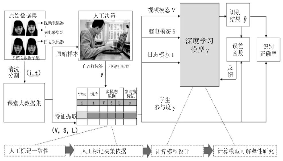 纵观上述研究与应用,目前已有的分析方法,大多假定依赖某一类数据集即可直接测量学习参与度。但实际课堂教学场景和在线学习场景都并非如此,例如,当前中小学课堂较多采用的平板电脑教学,学习现场经多种传感器采集,在教学过程中得到的包含视觉、声音、学习系统日志记录三种模态的数据,是一种普遍存在的带有领域特征的多模态情境。其中视觉数据和声音数据是按一定频率采样的连续信号,而学习系统日志的产生,属于离散事件(相邻记录的间隔时间没有规律)。尽管,学习参与度识别向目前相对成熟的人脸识别和情感识别方向重点发展,具有一定的合理性。但其完全基于视觉研究的局限性,也是显而易见的(如遮挡问题、专注地闭眼冥想问题等,容易造成误判)。这种视觉自动化系统要在实际学习环境普及与应用,还有很多工作要做。