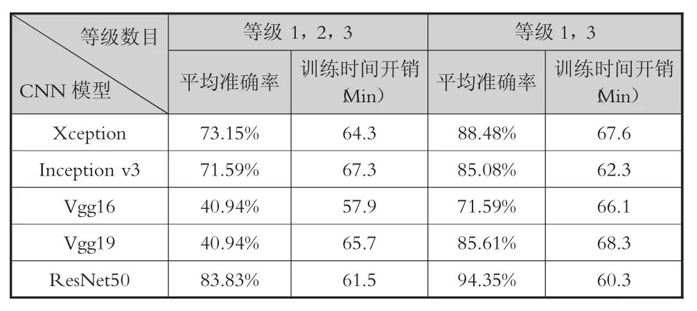 (3)CNN分类模型的选择。卷积神经网络是一类多层神经网络,在图像分类识别方面有着较出色的研究成果,在其发展过程中,先后出现了许多优秀的网络模型。根据Canziani A.等人在2016年对各种网络模型的性能比较[37],以及查阅ImageNet大规模视觉识别挑战赛(ILSVRC)中出色网络模型的相关论文[38],目前主流的分类模型有 Vgg16、Vgg19、Inception v3、ResNet50和Xception等5种。为了确定选用何种模型,研究团队针对上述5种模型,进行准确率与训练时间的对比实验。实验的结果如表3所示。