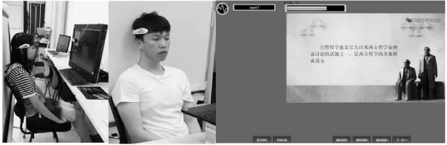 本研究招募了大学校园中的50名(男18名,女32名)学生参加实验,年龄范围是18岁~25岁;被试中有5名研究生,其余均为大学生,涵盖各年级,且被试专业多数为理工类;实验前要求被试关于实验内容的认知能力无差别。实验工具为脑电设备、摄像头、MOOC视频、视频内容相关的测试题等;MOOC视频截取自中国大学MOOC网的三段10分钟的视频(分别是《马克思哲学原理精粹九讲》、《网络与新媒体应用模式》、《数字营销:走进智慧的品牌》)。选取的片段内容相对完整且趣味程度各不相同,同时,经过初步现场观察,学生在三段视频中学习参与度存在明显差异,以确保能够采集到不同学习参与度的实验元数据。测试题均来自视频的内容,针对每个视频设计了10道单选题。实验数据采集工具为研究团队自行研制的可采集脑电波数据和定时拍照的程序Brain-Analysis,实验环境模拟学生在线学习场景(为便于图像分析加了白色背景幕)。实验场景如图2所示。