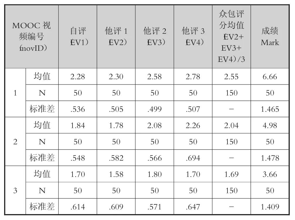 在实验过程中,每个被试均要对自己的参与情况打标签(EV1),并对另外三位被试的数据打标签(EV2、EV3、EV4),通过将记录的日志模态的数据导入SPSS,我们发现:自评和他评的数据存在一致性,采用众包(他评)的方法是可行的。同时,每个被试在实验的最后环节,需要针对视频中的学习内容做学习效果测试,得出一组测试分数(Mark),通过统计分析,得出表5。