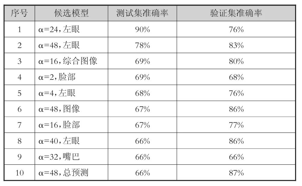经过分析,主要的原因应是验证集和测试集的数据分布不一致。模型选择依赖于验证集,如果验证集与测试集的数据分布差异太大,则会直接影响模型在测试集上的准确率。我们搜索在测试集上准确率最高的模型,具体如表6所示。其中“α=48,总预测”一项为实验中选出的最佳模型,在测试集上的准确率仅排在第10位;而“α=24,左眼”则以非常高的准确率(90.6%)排在第1位。这说明,虽然本实验所选取的验证集和测试集分别在性别和参与度级别方面都较为平衡,但是仍然有性别、参与度级别以外的其它未知因素,影响其数据分布规律,其中可能的因素包括被试的表情习惯、行为习惯等。