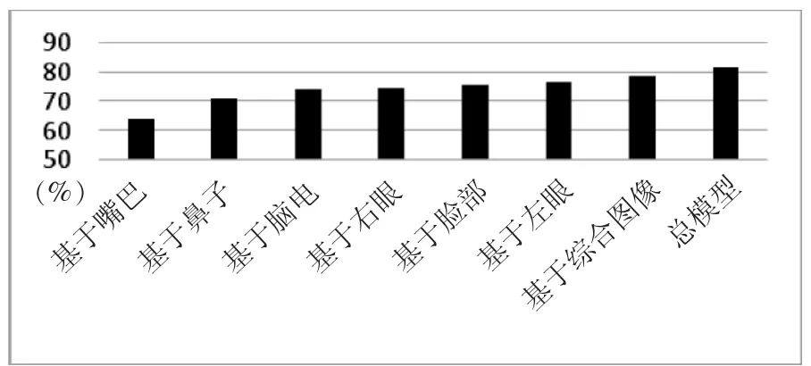 我们对这一现象进行了进一步的文献分析,发现在多模态融合实验中脑电波数据的准确度不高,这一结果也同样出现在其他研究者的实验当中。如Yongrui Huang等提出,两种用于情绪识别的脑与外周信号之间的多模式融合方法(其输入信号是脑电图和面部表情),共有20名健康受试者参加了两次实验。研究发现面部表情的准确率为74.38%,脑电图检测的准确率为66.88%,但两者融合则可达81.25%。这说明尽管EEG的准确率不高,但信息的组合补偿了它们作为单个信息源的缺陷[39]。Soleymani M.等提出了从脑电(EEG)信号和面部表情瞬间检测视频观众情绪的方法,结果也发现面部表情的结果优于EEG信号的结果[40]。原因可能在于面部肌肉活动污染对EEG信号的影响。但最终统计分析显示,在面部表情存在的情况下,EEG信号仍然带有补充信息。除此之外,也不能排除脑电波采集设备本身的影响,即采用更多通道的EEG设备,是否对提升准确率有帮助仍有待后续验证。