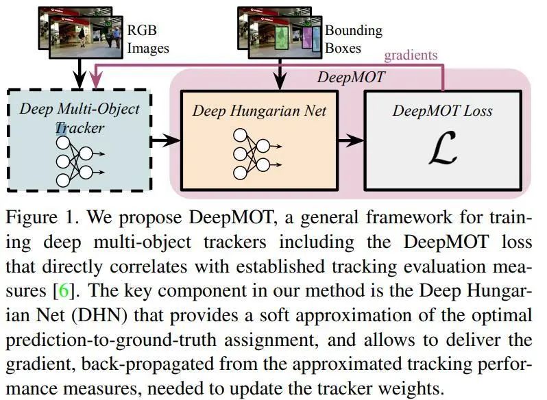 基于视觉的多目标跟踪(MOT)的最新趋势是利用深度学习的代表性力量来联合学习检测和跟踪目标。然而,现有的方法只使用损失函数训练某些子模块,而这些函数往往与建立的跟踪评估措施(如多目标跟踪精度(MOTA)和精度(MOTP))无关。由于这些措施不可微,如何选择合适的损失函数用于多目标跟踪方法的端到端训练仍然是一个有待研究的问题。在本文中,我们通过提出MOTA和MOTP的可微代理来弥补这一差距,我们将其合并为一个适合于深度多目标跟踪器端到端训练的损失函数。作为一个关键的组成部分,我们提出了一个DeepHungarian Net(DHN)模块,它近似Hungarian匹配算法。DHN允许估计目标轨迹和地面真值对象之间的对应关系,计算MOTA和MOTP的可微分代理,进而直接用于优化深度跟踪器。实验证明,所提出的可微框架改善了现有多目标跟踪器的性能,并在MOTChallenge基准测试上建立了一种新的技术。