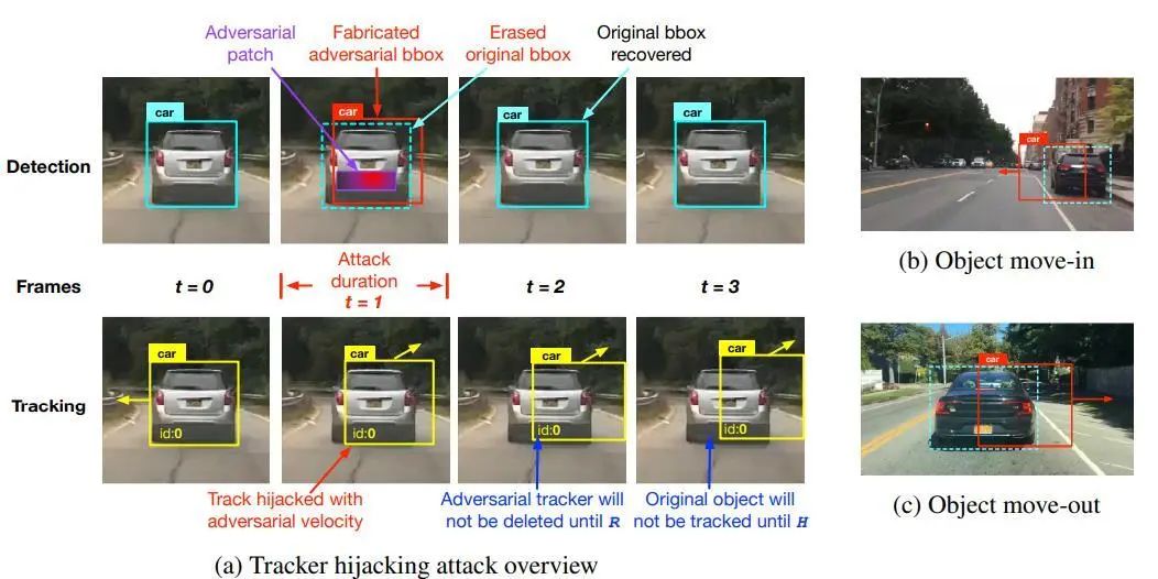 本文首次研究了自动驾驶系统中针对完整视觉感知管道的敌对机器学习攻击,发现了一种利用AEs在目标检测上有效欺骗MOT的新攻击技术——跟踪器劫持。使用我们的技术,成功的AEs仅在一个帧上就可以移动现有的物体进入或离开自动驾驶汽车的前进方向,从而造成潜在的安全隐患。我们使用Berkeley Deep Drive数据集进行评估,发现平均攻击3帧时,我们的攻击成功率接近100%,而盲目检测目标对象的攻击成功率只有25帧.