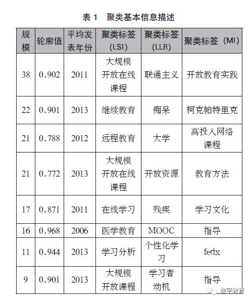 第一,聚类标签需要重新调整与修订。本研究参考LSI、MI 法生成的聚类标签,对LLR 法生成的聚类标签进行了适当调整。重新命名后的各类标签名称依次为慕课、继续教育、高校、开放资源、障碍或缺陷、医学教育、个性化学习、学习者动机,各类所集中反映的国外在线课程评价研究的主题依次为在线课程本体评价、继续教育领域在线课程评价、高等教育领域在线课程评价、开放教育资源视角下在线课程评价、在线课程无障碍性评价、医学教育领域在线课程评价、以个性化学习为导向的在线课程评价、关注学习者学习心理特征的在线课程评价。除医学教育以外,其他各聚类中在线课程均以MOOC 为主。
