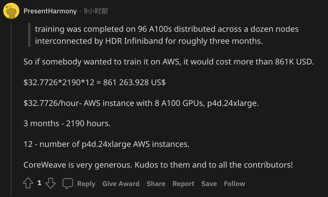 有人根据 AWS 的收费标准粗略地计算了一下训练过程所需要的成本,大概有 86 万美元: