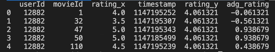 Mean = Ratings.groupby(by="userId", as_index=False)['rating'].mean()Rating_avg = pd.merge(Ratings, Mean, on='userId')Rating_avg['adg_rating'] = Rating_avg['rating_x'] - Rating_avg['rating_y']print(Rating_avg.head())