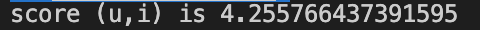 def User_item_score(user,item):a = sim_user_30_m[sim_user_30_m.index==user].valuesb = a.squeeze().tolist()c = final_movie.loc[:,item]d = c[c.index.isin(b)]f = d[d.notnull()]avg_user = Mean.loc[Mean['userId'] == user,'rating'].values[0]index = f.index.values.squeeze().tolist()corr = similarity_with_movie.loc[user,index]fin = pd.concat([f, corr], axis=1)fin.columns = ['adg_score','correlation']fin['score']=fin.apply(lambda x:x['adg_score'] * x['correlation'],axis=1)nume = fin['score'].sum()deno = fin['correlation'].sum()final_score = avg_user + (nume/deno)return final_scorescore = User_item_score(320,7371)print("score (u,i) is",score)