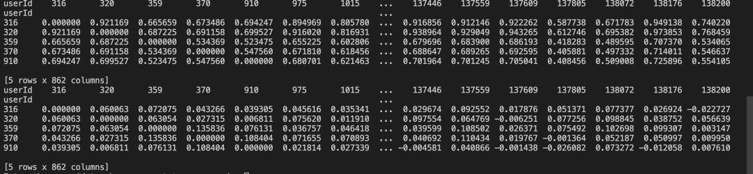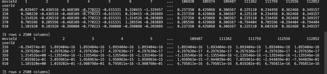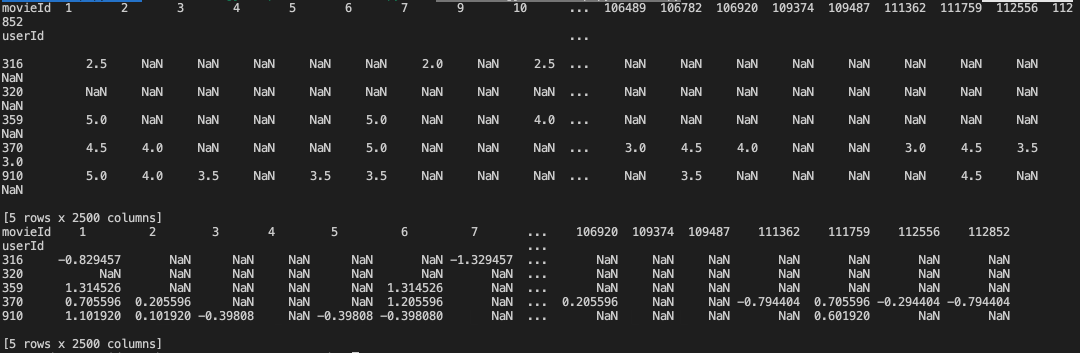 check = pd.pivot_table(Rating_avg,values='rating_x',index='userId',columns='movieId')print(check.head())final = pd.pivot_table(Rating_avg,values='adg_rating',index='userId',columns='movieId')print(final.head())