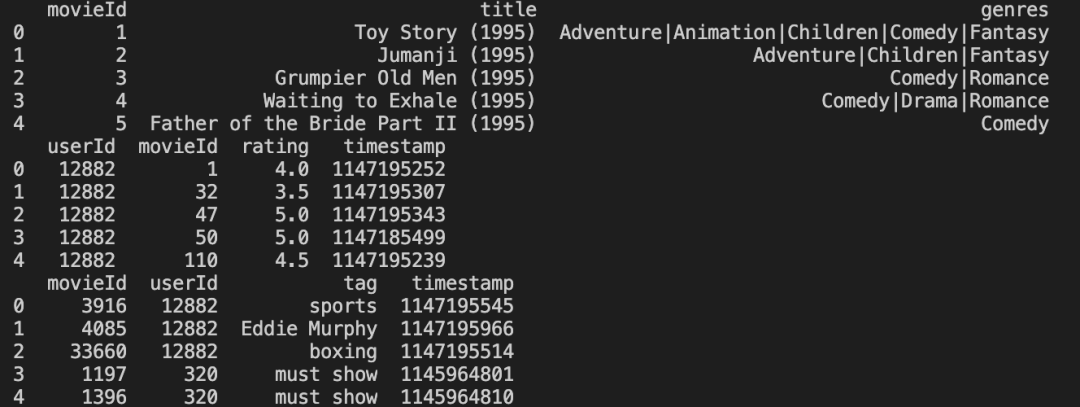 print(movies.head())print(Ratings.head())print(Tags.head())