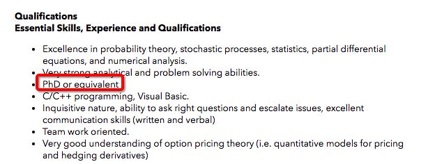 曾有一位华尔街量化大佬表示:“如果你没有计算金融、物理、工程或者统计等等偏Quant的硕士或者博士学位 ,几乎是不可能在顶级quant trading公司找到工作。”