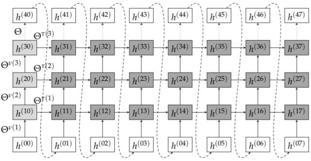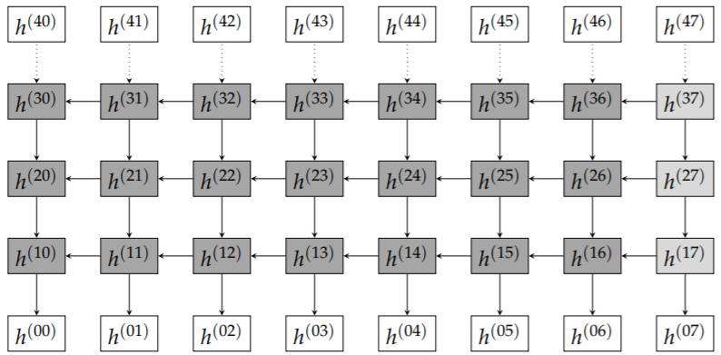 图 6.1 RNN 架构,数据在「空间」和「时间」域同时传播。在我们的例子中,时间尺寸为 8,而空间尺寸为 4。