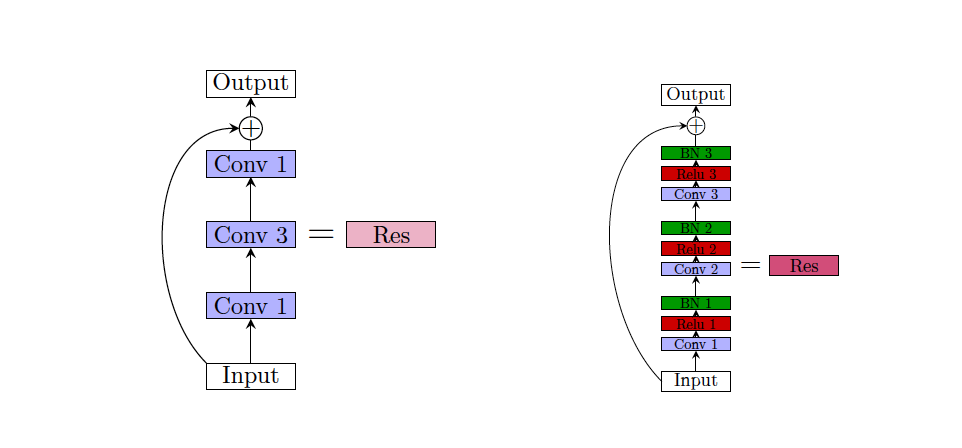 残差模块有两个重点必须要提。一,通常的卷积-卷积-卷积(conv-conv-conv)结构将导致下一个输出(不考虑出于简化目的和当前时间的批归一化,表示无需在 1 x 1 卷积操作中进行 padding),