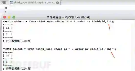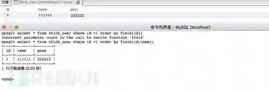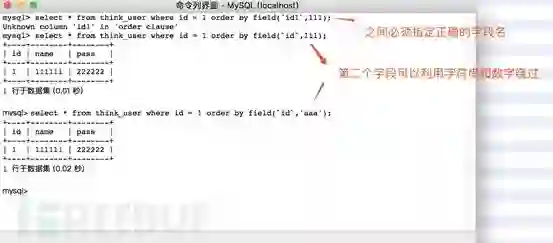 所以,我们要利用该漏洞,第一我们至少需要知道表中的一个字段名称,第二向field()函数中中传入两个字段。第二个字段不需要知道字段名,用数字或字符串绕过即可。