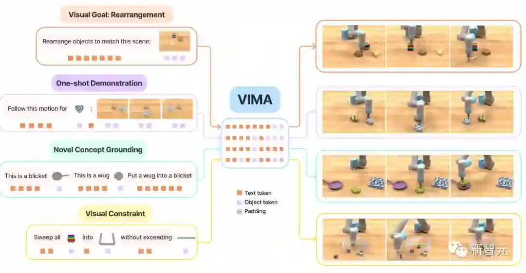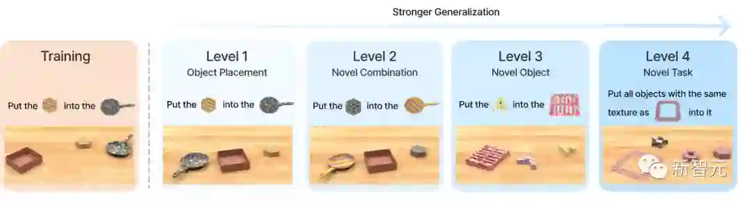 为了训练和评估VIMA,研究人员提出了一个新的模拟基准数据集,包含上千个由程序生成的带有多模态提示的桌面任务,和60多万条专家轨迹用于模仿学习,以四个等级来评估模型的泛化性能。