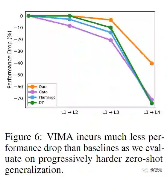 在渐进泛化(Progressive Generalization)性能对比中,在面向更难的泛化任务中,没有采用任何微调。VIMA模型的性能倒退最少,尤其是从L1到L2和L1到L3,而其他模型退化超过了20%,这也意味着VIMA学习到了更泛化的策略,更健壮的表征。