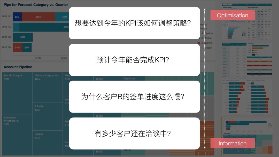 他每天从他的数据阅读到决策优化的进程中,他会问四个典型问题,有多少客户还在洽谈中,为什么客户