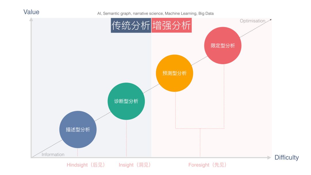传统交互式数据可视化分析主要涵盖了描述型分析和诊断型分析,而预测型分析和限定型分析是对未来提供先见的增强分析(augmented analysis)。