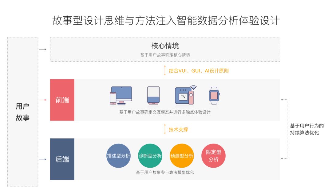 所以,未来BI的体验,是用户在不同情境下,基于不同设备触点,通过自然语言的方式与机器进行交互,进而获得决策辅助相关的各种洞见的一个过程。而故事型设计思维,在这样的体验设计中依然适用。