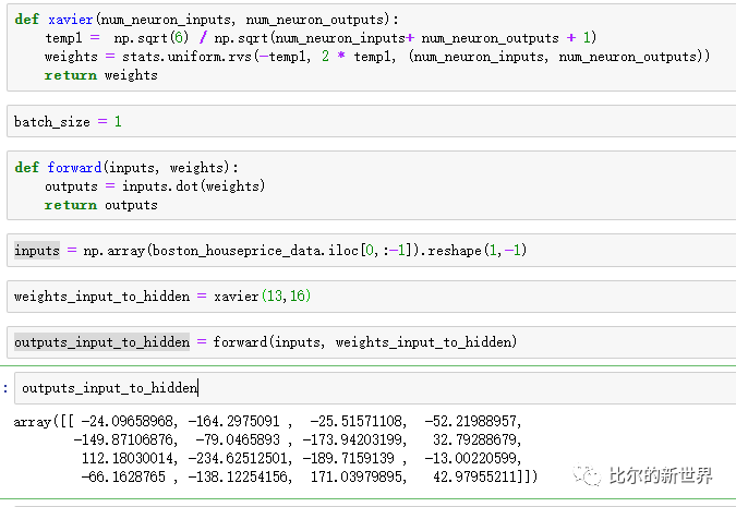 除去MEDV外,一共还有13个数据,这13个数据将被输入到输入层的13个神经元当中,输入层的神经元个数与输入数据的信息维度一致,我们将输入数据表示为inputs。