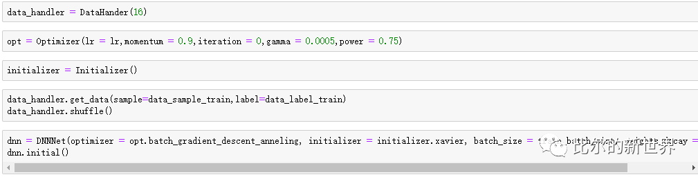 然后可以使用数据处理模块(DataHander),优化器模块(Optimizer),数据初始化模块(Initializer),网络搭建模块(DNNnet),批量读取数据并搭建深度神经网络: