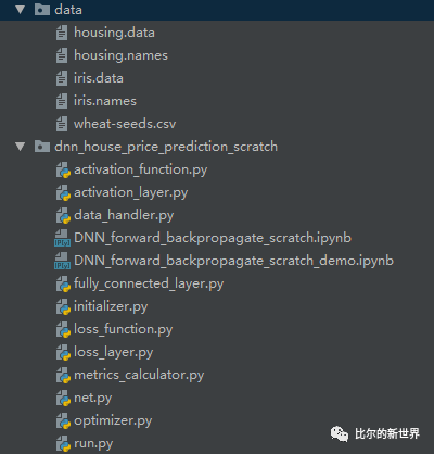 整个项目结构如下图所示,包含一个数据目录和代码目录。代码目录包含激活函数(层),数据处理,全连接层,初始化,损失函数(层),评估指标计算,网络搭建,梯度优化器这几个模块: