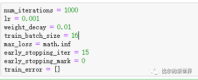 定义一些神经网络的参数,如迭代次数(num_iterations,学习次数),学习率(lr, 调节参数更新幅度),一次学习的数据大小(train_batch_size),还有一些早停参数(防止学习过猛), train_error用于记录每次学习误差: