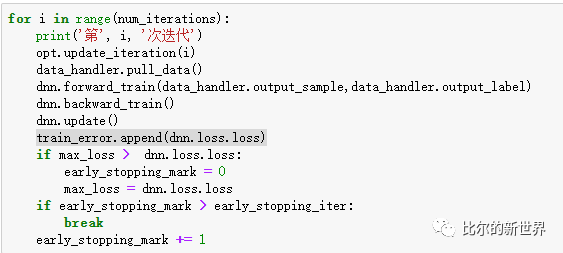 接下来可以开始训练了,每次拉取一批数据data_handler.pull_data(),然后进行前向传播dnn.forward_train(),后向传播dnn.backward_train(),更新参数dnn.update(),记录训练误差train_error.append(dnn.loss.loss),这个过程反复很多次,直到训练误差连续15次都没有降低( 通过early_stopping_iter参数进行设置):