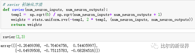 神经网络参数通过后向传播不断优化,使得模型预测值与真实值接近。一开始我们并不知道最优参数值,需要对参数进行随机初始化。对参数进行怎样的随机初始化其实也很有讲究,特别是对于深度神经网络。本文当中,我们使用xavier初始化方法,源自论文“Understanding the difficulty of training deep feedforward neuralnetworks”。假设我们输入层神经元为2,隐藏层神经元为3,则连接这两层之间的参数进行初始化代码如下: