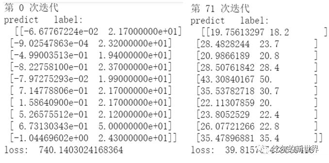 我们可以看到,第一次训练,神经网络的预测值跟真实值完全不搭边,但是训练到第71次的时候,预测值与真实值已经很接近了: