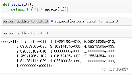 现在我们得到了第一个隐藏层的输入数据,接下来我们需要将该层每一个神经元的数据输入到激活函数得到隐藏层的输出。这里我们使用sigmoid激活函数,代码如下: