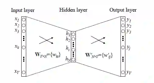 第二步,通过梯度上升法来更新我们的 和 ,注意这里的 周围有 个词向量,此时如果我们期望 , 最大。此时我们注意到由于上下文是相互的,在期望 , 最大化的同时,反过来我们也期望 , 最大。那么是使用 好还是 好呢,word2vec使用了后者,这样做的好处就是在一个迭代窗口内,我们不是只更新 一个词,而是 共 个词。这样整体的迭代会更加的均衡。因为这个原因,Skip-Gram模型并没有和CBOW模型一样对输入进行迭代更新,而是对 个输出进行迭代更新。