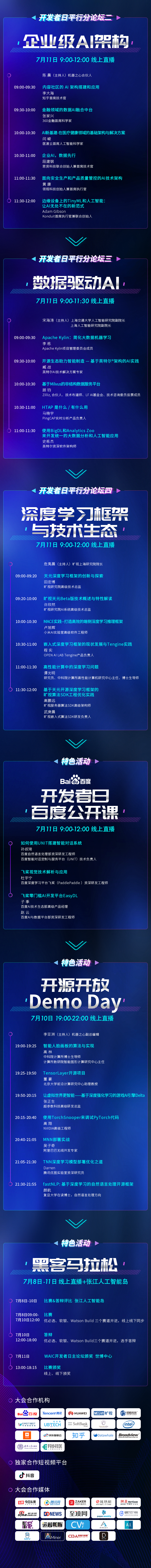 大环节,包括1场主论坛、4场分论坛、1场高峰对话、1堂百度公开课、1场开源项目Demo Day,1场黑客马拉松,这是一次丰富多元的学习之旅。