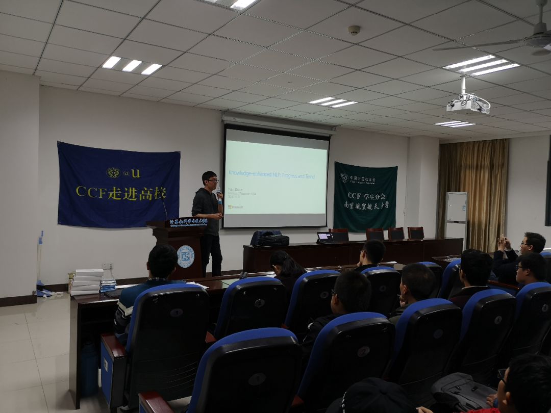 报告开始,赵彦超对“CCF走进高校”活动和本次的特邀讲者做了简要的介绍。随后段楠开始了题为“基于知识的自然语言处理研究:最新进展和未来趋势”的报告。