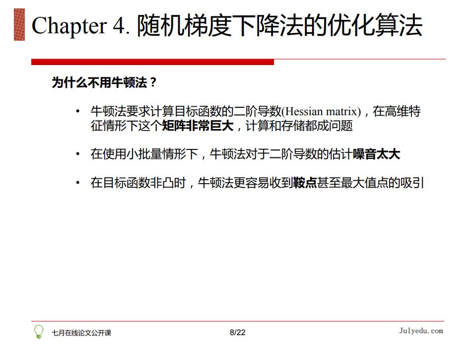 那到底如何优化随机梯度法呢?详情请点击:论文公开课第一期:详解梯度下降等各类优化算法(含视频和PPT下载)(链接:https://ask.julyedu.com/question/7913)。