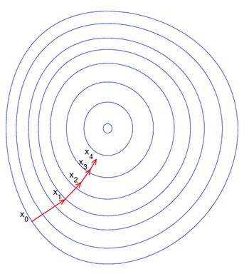 由于牛顿法是基于当前位置的切线来确定下一次的位置,所以牛顿法又被很形象地称为是"切线法"。牛顿法的搜索路径(二维情况)如下图所示: