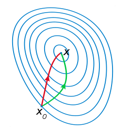 注:红色的牛顿法的迭代路径,绿色的是梯度下降法的迭代路径。