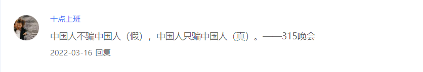 一位用户这样总结今年的315晚会的核心:中国人不骗中国人(假),中国人只骗中国人(真)。