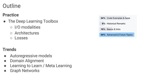 内容主要分为实践和趋势两个部分,其中实践包含最新的卷积网络,循环网络,Attention机制的应用和技巧,趋势部分包括最新的元学习,图结构学习等内容。