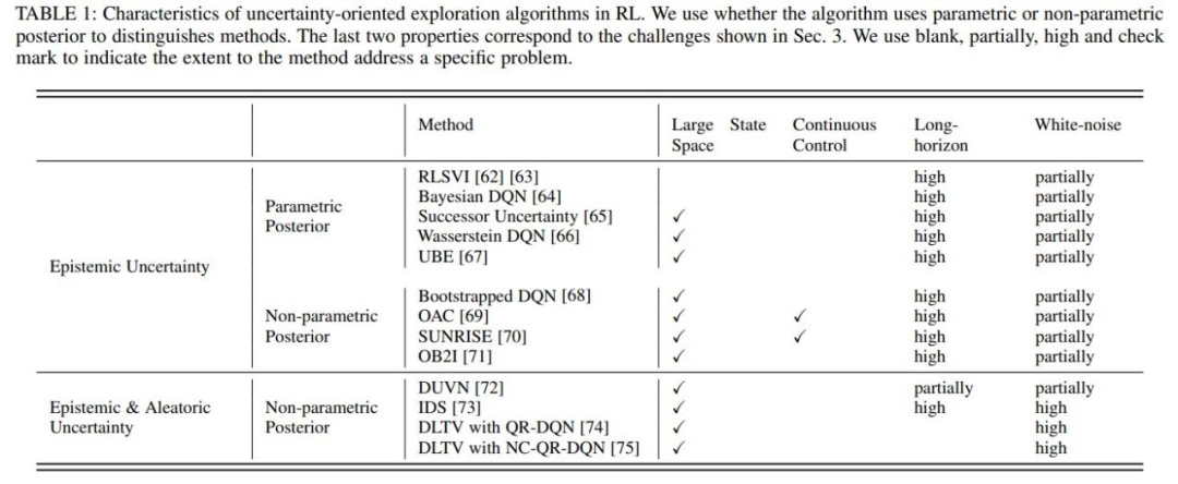 综述中总结了这些挑战产⽣的原因,及可能的解决⽅法,同时在详细介绍⽅法的部分,针对现有⽅法对这些挑战的应对能⼒进⾏了详细的分析。如下图就分析了单智能体强化学习中基于不确定性的探索⽅法解决这些挑战的能⼒。