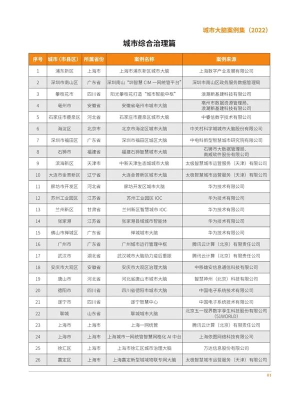 截至2021年12月,共征集到来自23家单位提供的35项城市大脑案例,来自直辖市、地级市、县级市以及新区/园区等多类地域,主要应用场景覆盖城市治理、智慧政务、智慧交通、智慧生态、智慧经济、智慧能源和产业融合等多个领域,综合展现了各地市结合本地实际需求在城市大脑方向的探索与实践。通过整理收集的案例,全国信标委智慧城市标准工作组组织各案例提供单位共同编制完成了《城市大脑案例集(2022)》(以下简称“案例集”)。