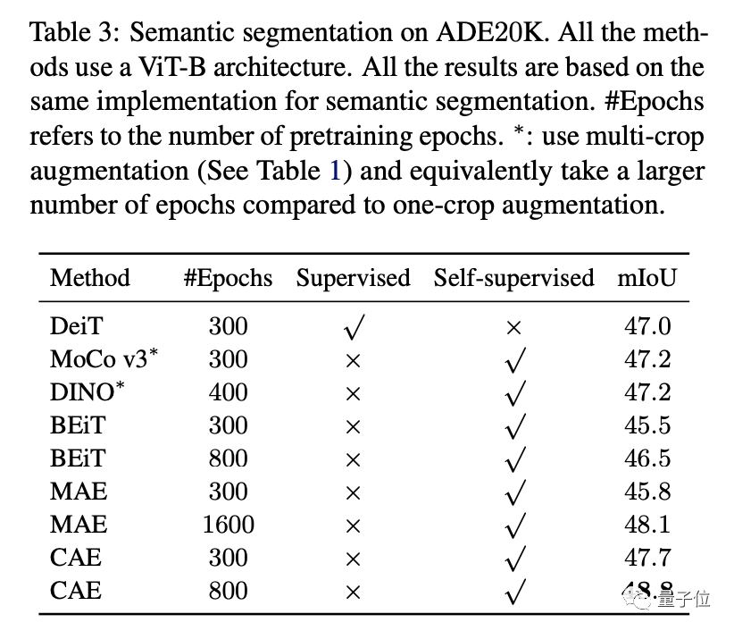 除此之外,也进一步验证了以CAE为代表的MIM方法,要比Moco v3、DINO为代表的对比学习方法更适合下游任务。