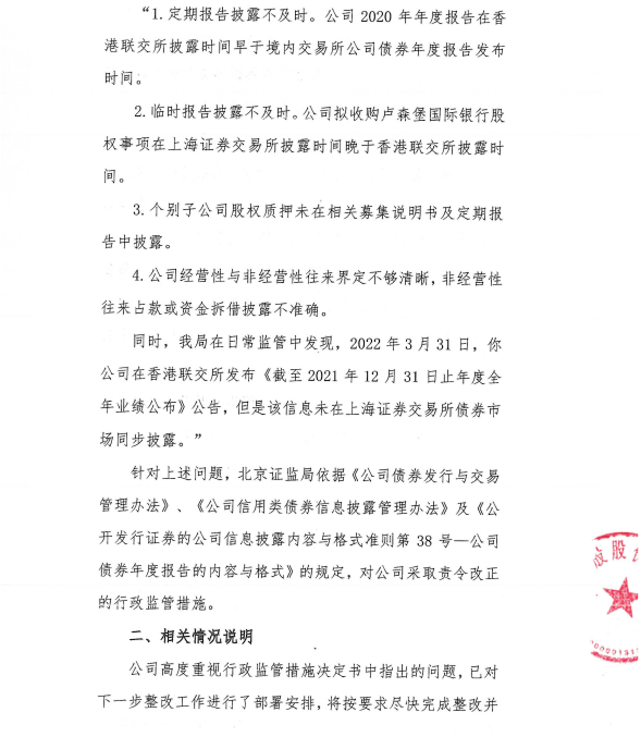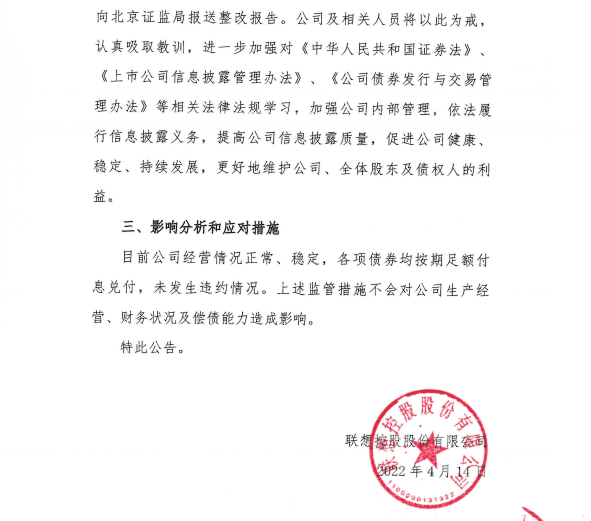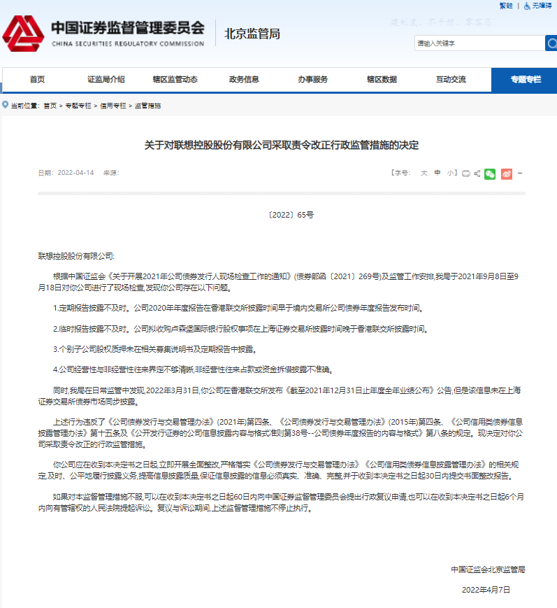 4月14日,北京证监局网站披露近日对联想控股股份有限公司采取责令改正行政监管措施的决定,发现公司存在报告披露不及时、公司经营性与非经营性往来界定不够清晰等问题,责令其立即全面整改,30日内提交书面整改报告。