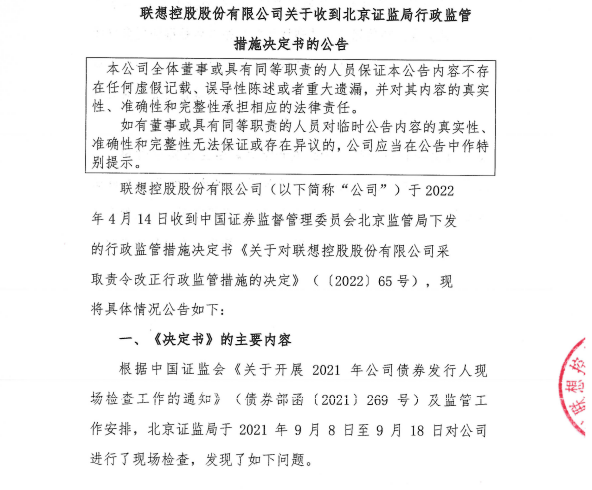 对此,联想控股今日发布公告称,公司已经收到北京证监局行政监管措施决定书。公司高度重视行政监管措施决定书中指出的问题,已对下一步整改工作进行了部署安排,将按要求尽快完成整改并向北京证监局报送整改报告。