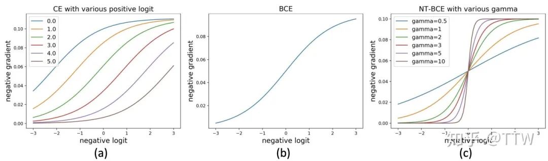 第二个问题我们在文中称为负样本的过度抑制 (over-suppression of negative labels),一个简单粗暴的解决思路便是,不要对负样本持续施加过重的惩罚,而是点到为止。我们只需要对分类器的负类输出进行一个简单的线性变换就能够实现上述功能,不要忘记加上正则化系数约束梯度值的范围。变换后函数请见后文的整体公式,它对负类输出的梯度与 CE 和 BCE 一同对比如下图所示。
