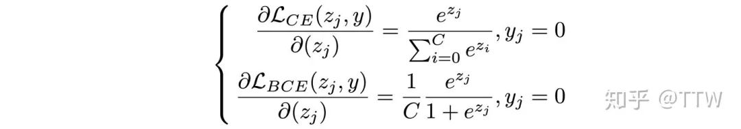 对于第二个问题,我们知道 Cross-Entropy Loss (CE Loss) 是单标签分类中常见的损失函数,其中 softmax 的计算强调分类器需要输出唯一最大预测值,同时正负类别的预测值在损失函数中存在相互影响;而多标签分类则多使用 Binary Cross-Entropy Loss (BCE Loss) ,将任务拆解为一系列相互独立的二分类问题,并以 sigmoid 计算每一类别的输出预测值。