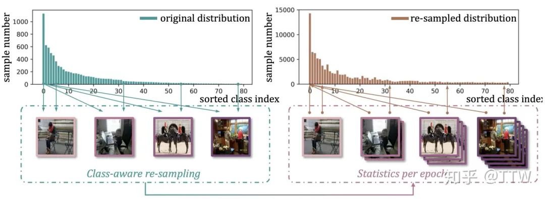 对于第一个问题,我们注意到重采样 (re-sampling)是一个常见而有效的策略,在几个最新工作[1,2,3,4]中都作为关键组件出现,其中[3,4]提出重采样法对分类器学习有显著促进作用。但这种方法并不能顺滑地迁移到多标签情景中,因为标签的共存性 (co-occurrence)将导致不同类别在采样时无法解耦。举个栗子,如果数据集中有限的几张牙刷图片样本都同时包含刷牙的人在其中,那么在对“牙刷”这一尾部类别进行重采样时,对“人”这一头部类别的采样也会只多不少。同时,注意到“刷牙的人”此时就会比“单独出现的人”具有显著更高的采样频率,为头部类别额外引入类内不均衡的问题。
