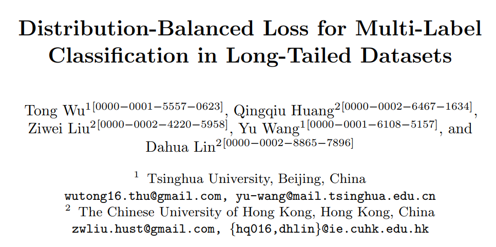 我们的《Distribution-Balanced Loss for Multi-Label Classification in Long-Tailed Datasets》很荣幸被接收为 ECCV 2020 的 Spotlight Presentation。本文关注的是长尾分布下的多标签分类问题,并提出了一种分布平衡损失函数 (Distribution-Balanced Loss),在 COCO-MLT 和 VOC-MLT 这两个人工构造的多标签长尾数据集上进行实验验证,取得了很好的效果。文章和代码均已公开。